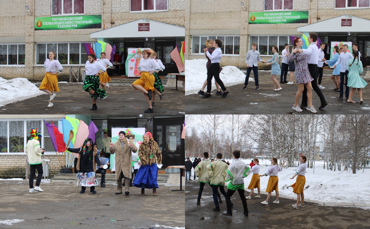 Праздничные мероприятия Масленица и 8 Марта состоялись на крыльце техникума. Народ собирали наши веселые скоморохи Кошелев Тимофей и Стукалин Игорь. Приходу «Весны» (Листратова А.) хотели помешать сказочная нечистая сила «Зима» (Бегоутова М.А.), «Леший» (Рябов А.А.) и «Баба-Яга» ( Могина Т.А.). На защиту встал «Емеля» (Губанов И.). Вызвал наш герой Ильина Дениса с гармошкой, чтобы нечистая сила сбилась с ног от танцев. Так и пришлось «Зиме» со своими друзьями уйти восвояси. Но «Весна» так и не шла. Коллектив «Эдельвейс» исполнил танец «Я огонь-ты вода», чтобы призвать «Весну». Долгожданная красавица пробудилась ото сна,поздравила всех с началом весны и международным женским днем 8 Марта.